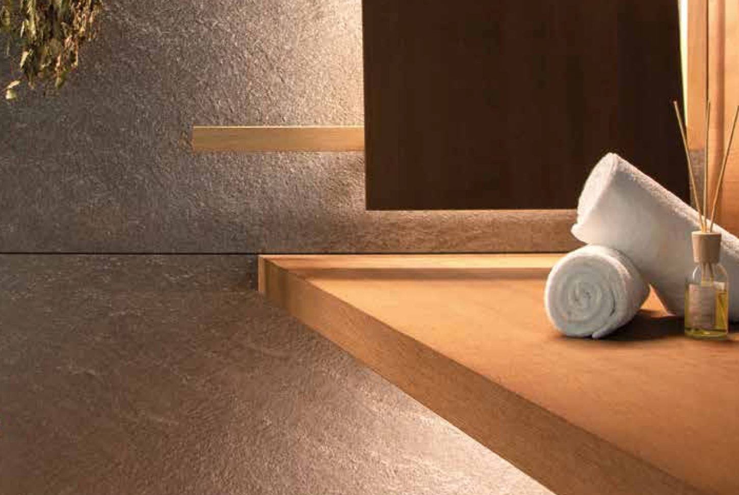 Sauna walls finished with SaunaBoard panels in natural wood veneer or stone imitation.