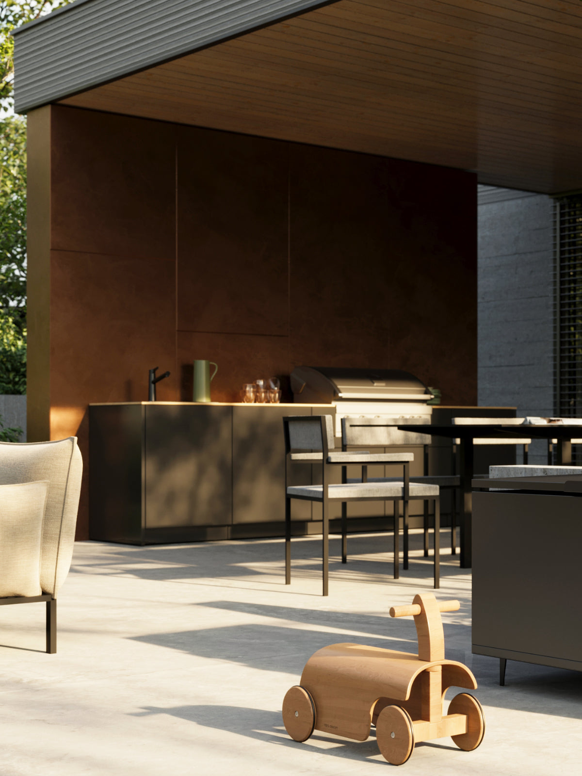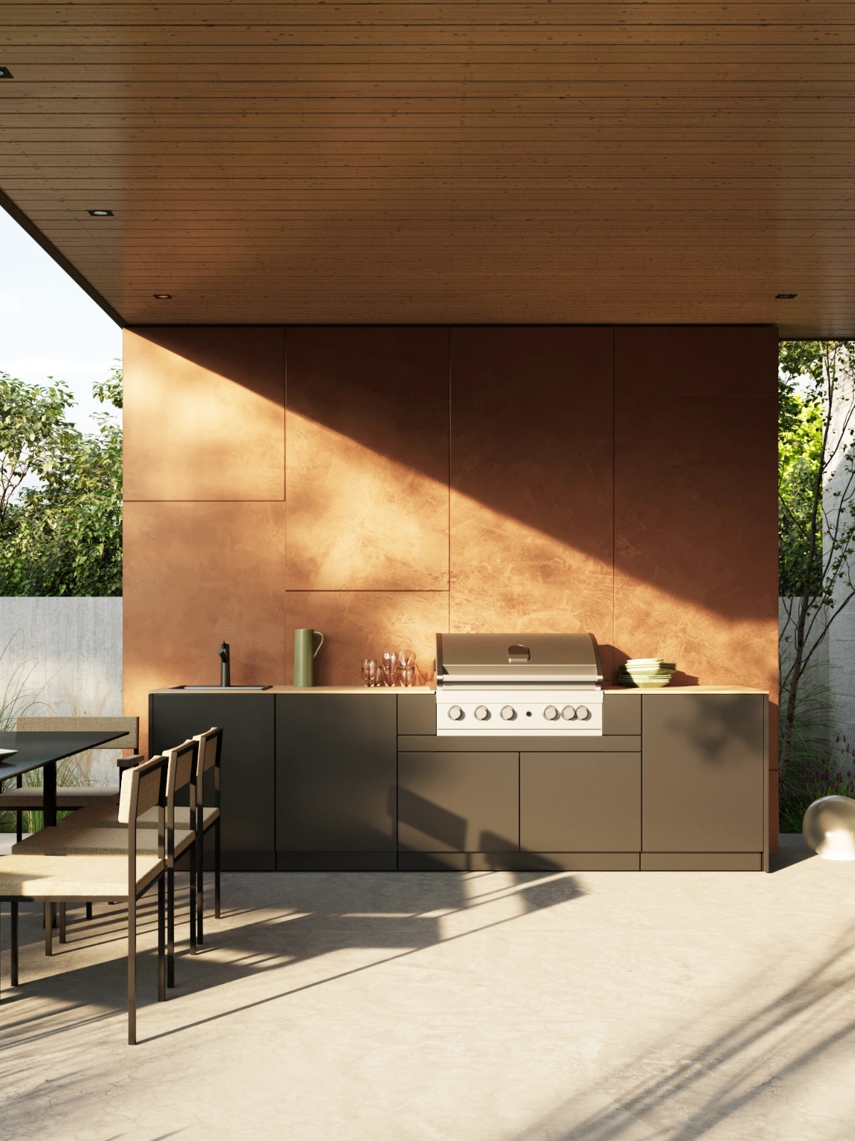 Det neutrale, attraktive men diskrete design kan tilpasses for at komplementere den overordnede stil af udendørsområdet og den eksisterende arkitektur i hjemmet. Det giver en alsidig plads til at være vært for sammenkomster, familiemåltider og nyde udendørs, mens man forbereder lækre måltider.